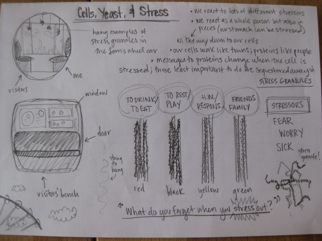 In the end, I chose to actually talk about my current research about stress granules. After a brainstorming beer with Annika outside Pustervik, I came up with the following, participatory exhibit scheme which I think Nina Simon herself would be proud: